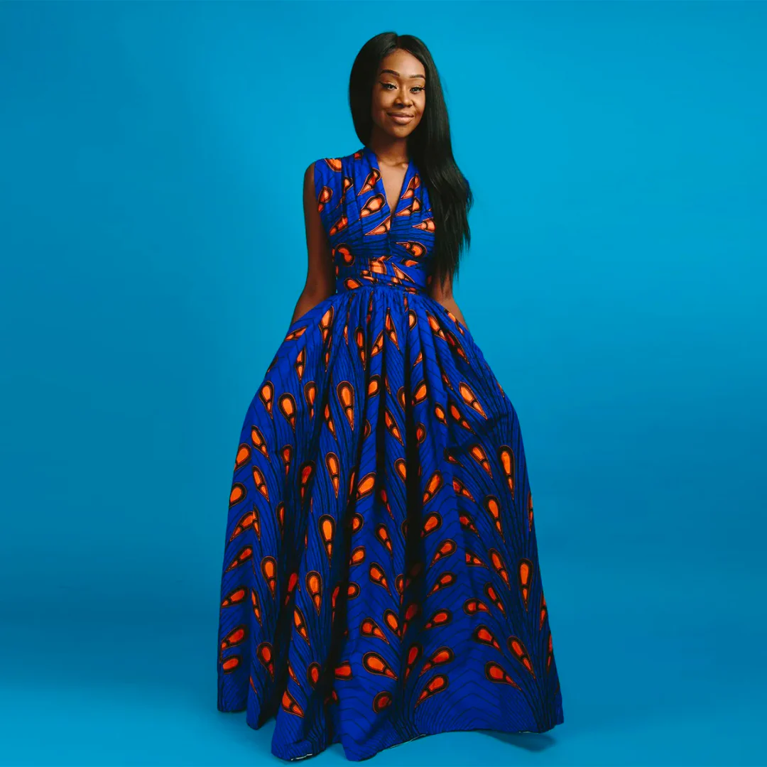O calor do verão às vezes pode ser sufocante a tal ponto que tudo o que evoca o mar e seu lado refrescante é uma verdadeira alegria; Com este magnífico  Vestido Azul Africano  , refresque-se sem colocar os pés no mar. A parte superior justa e aberta que realça os ombros e o peito combinada com a parte inferior larga literalmente expõe você ao vento, garantindo assim uma excelente ventilação sem sacrificar nada ao seu corpo. desejo de ser sexy e livre para se mover.
